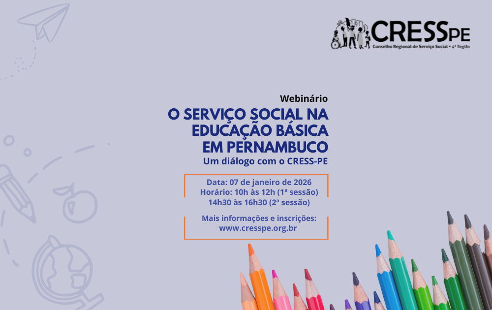 Inscrições abertas para o webinário "O Serviço Social na Educação Básica em Pernambuco: um diálogo com o CRESS-PE"